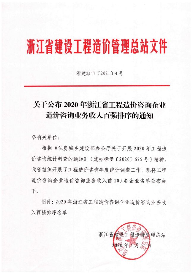 2020年浙江省工程造价咨询企业造价咨询业务收入百强