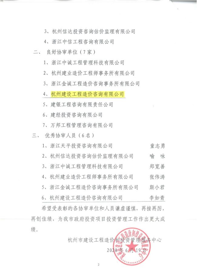 2019年度杭州市政府投资项目优秀单位