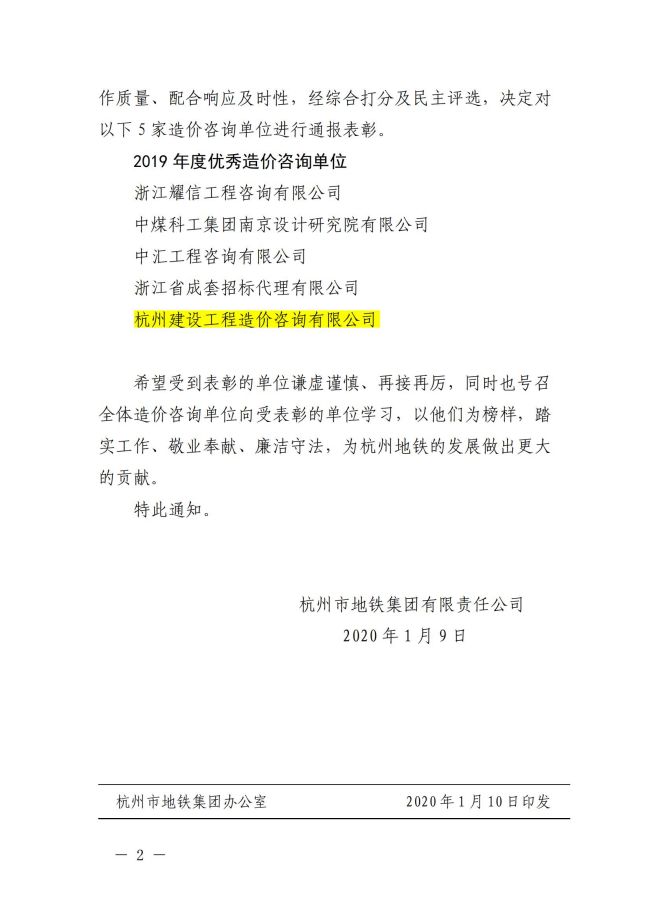 2019年度杭州市地铁集团优秀造价咨询单位
