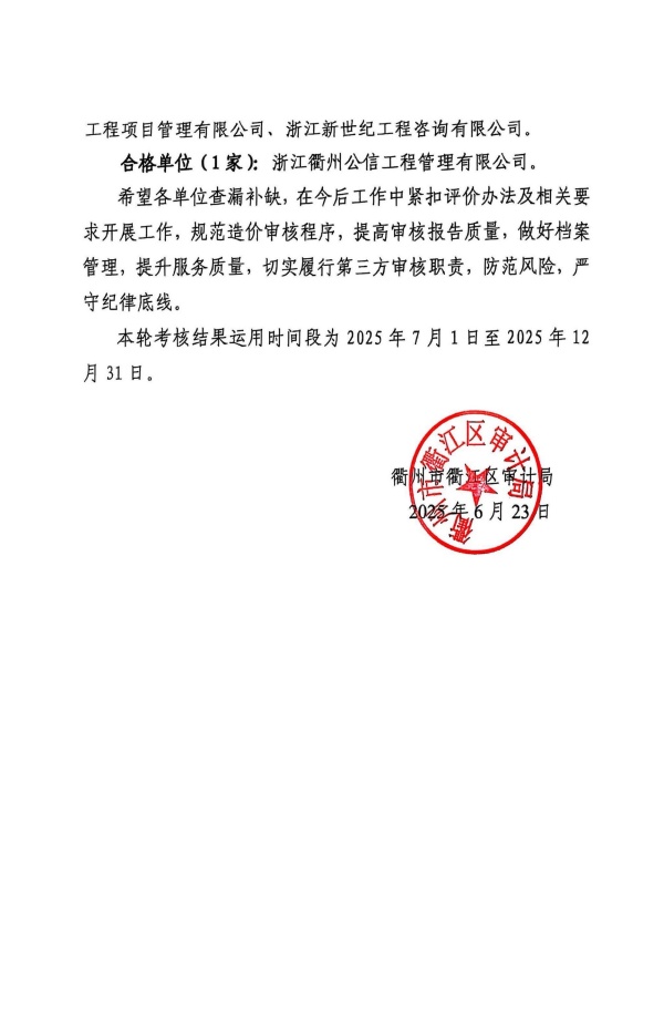 2025-2027年度衢江区政府投资项目结算审核工作第一轮考核优秀单位